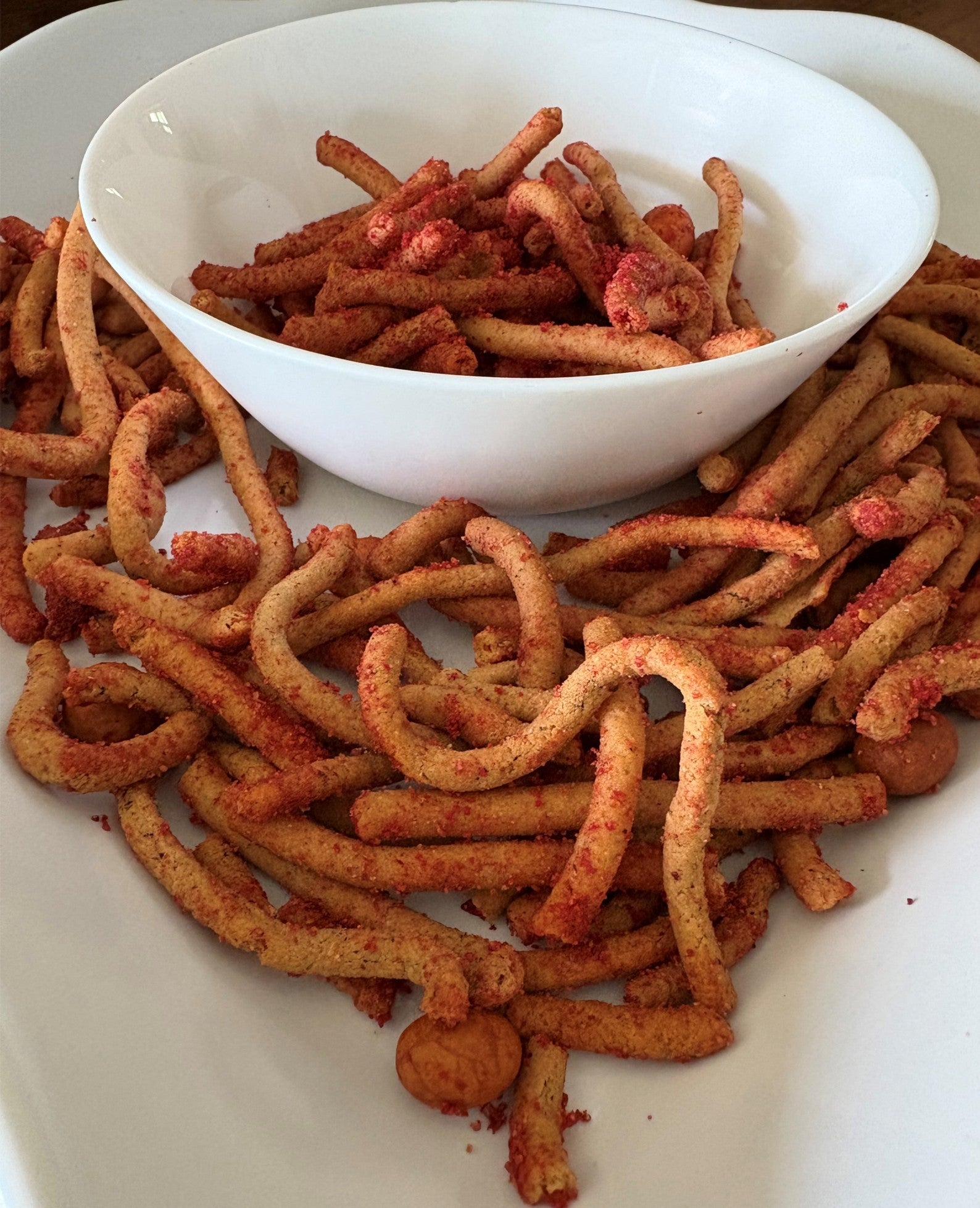 - Spicy, crunchy corn sticks with chili powder